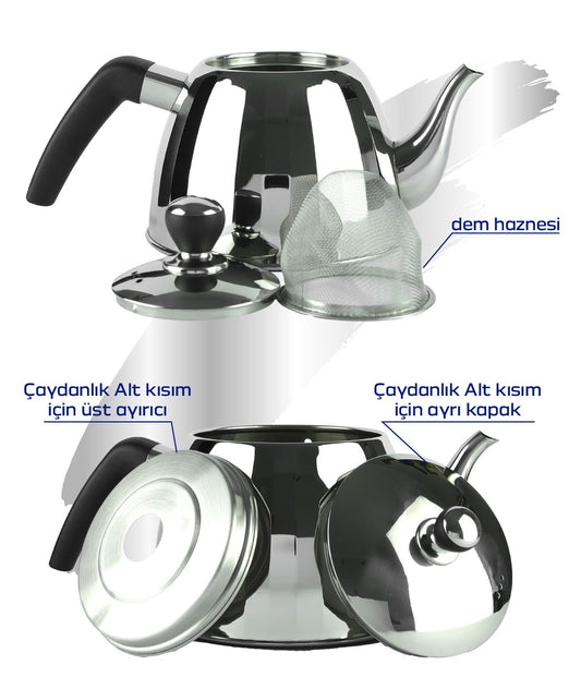 3 + 2 Litre Alman Çelik Çaydanlık – Şık Kulp Detaylı, Filtreli, İndüksiyon Uyumlu (Yan Yana Kullanım)