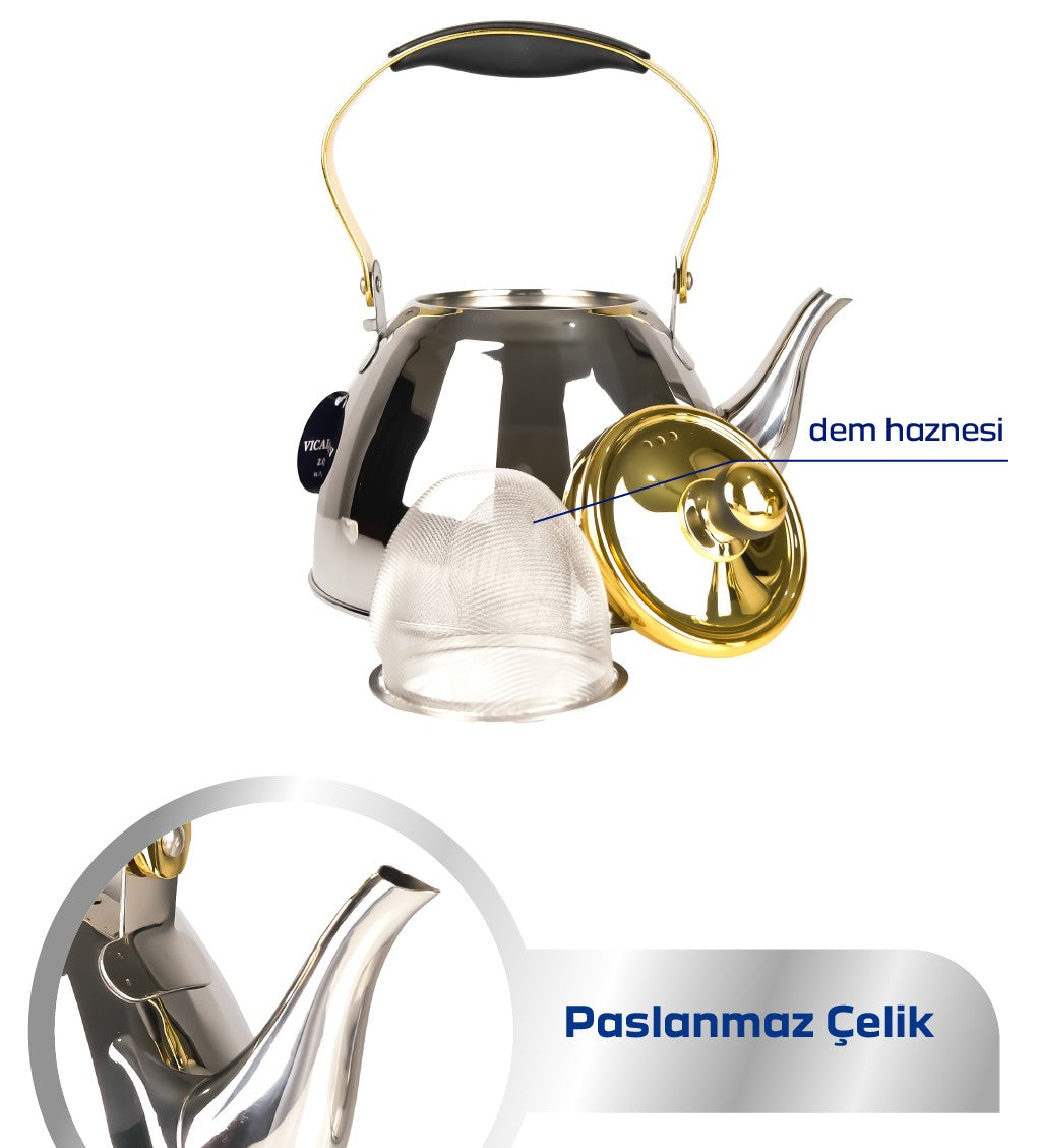 3 + 2 Litre Alman Çelik Çaydanlık – Şık Kulp Detaylı, Filtreli, İndüksiyon Uyumlu (Yan Yana Kullanım)