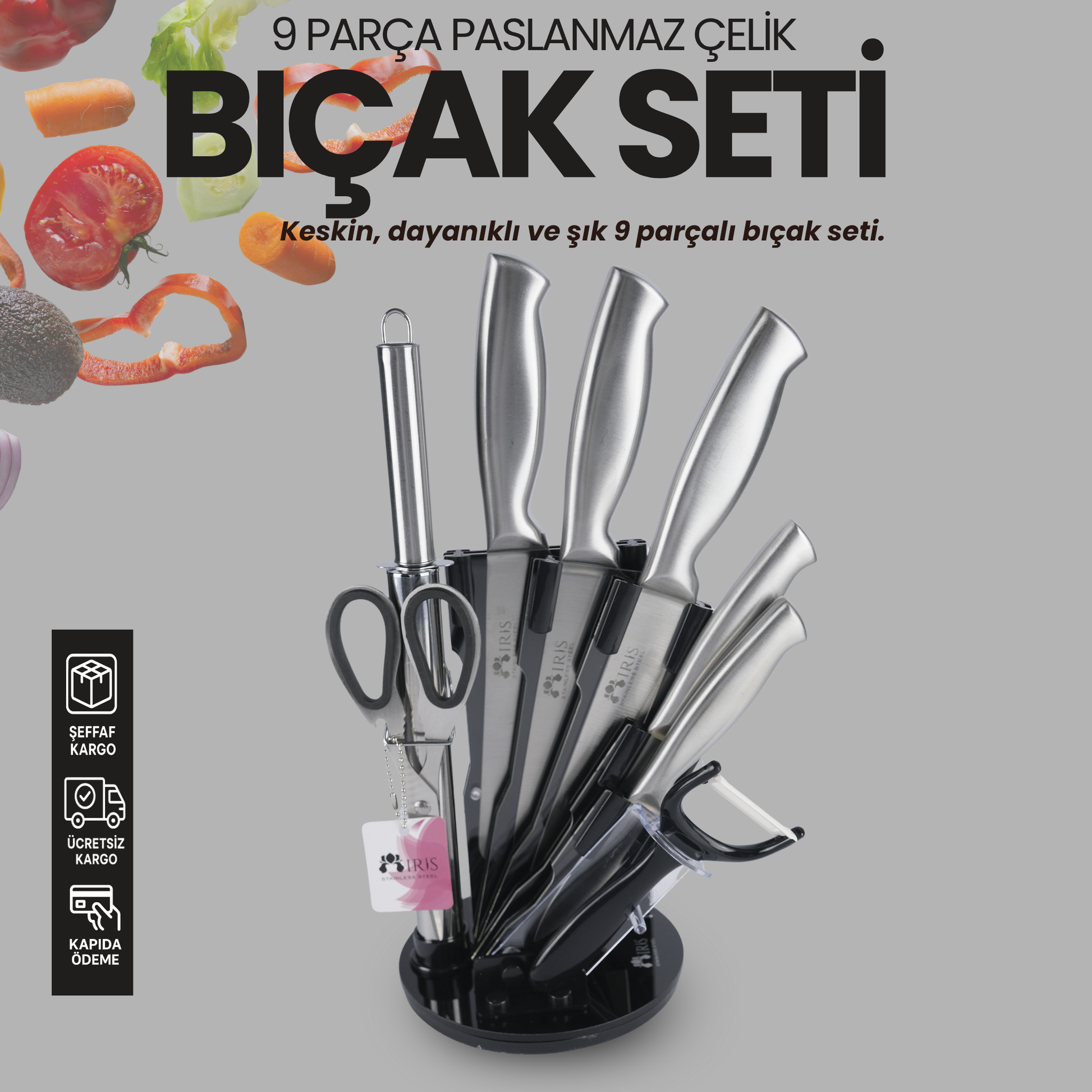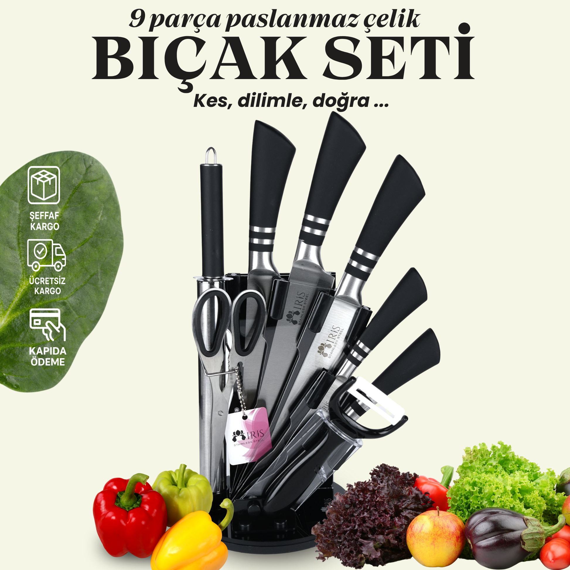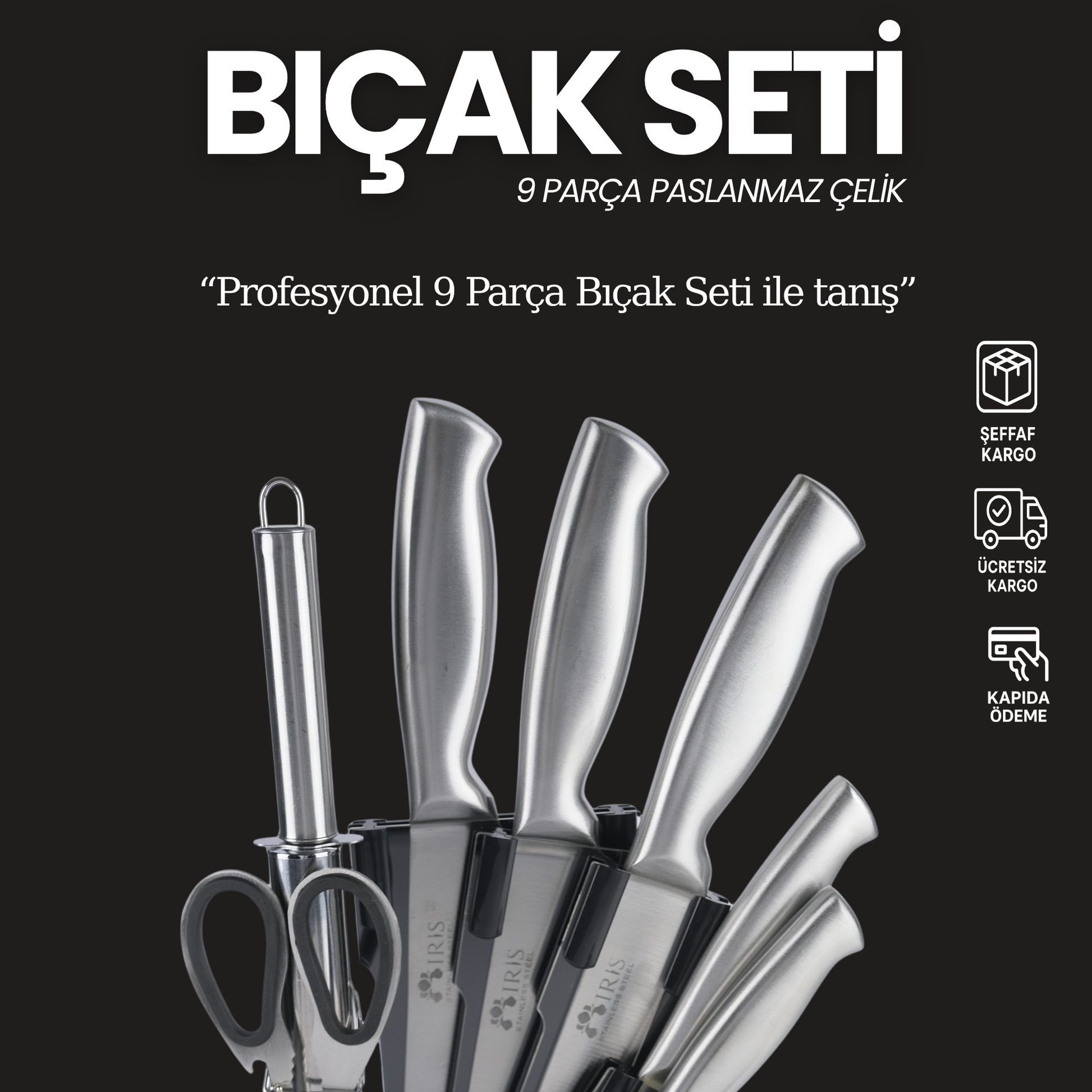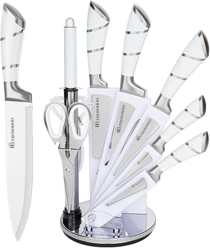 Profesyonel 9 Parça Bıçak Seti – 360° Dönen Stant ile beraber Üstün Keskinlik ve Şık Tasarım Bir Arada